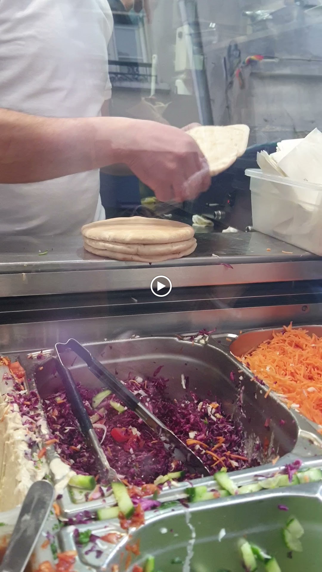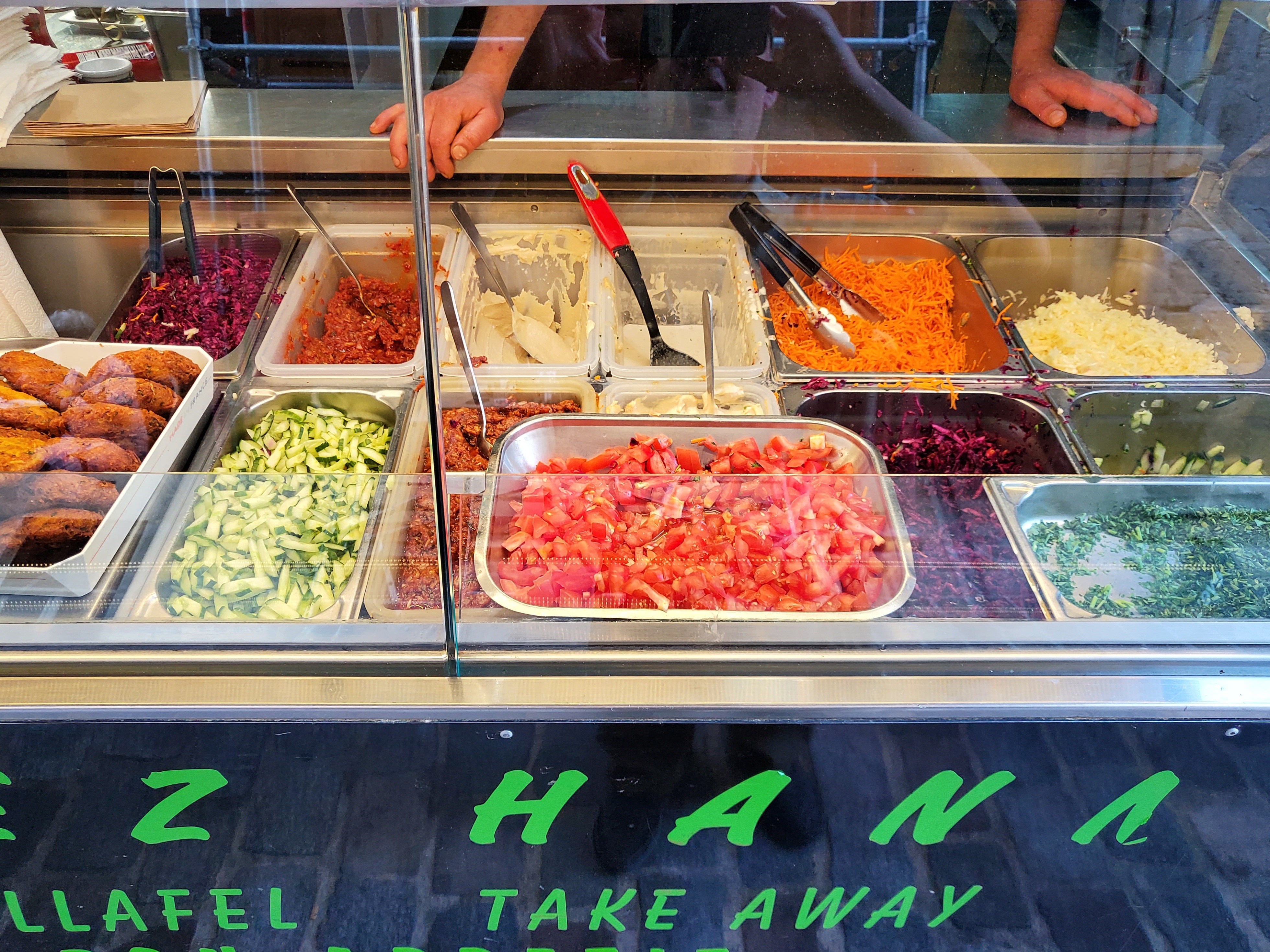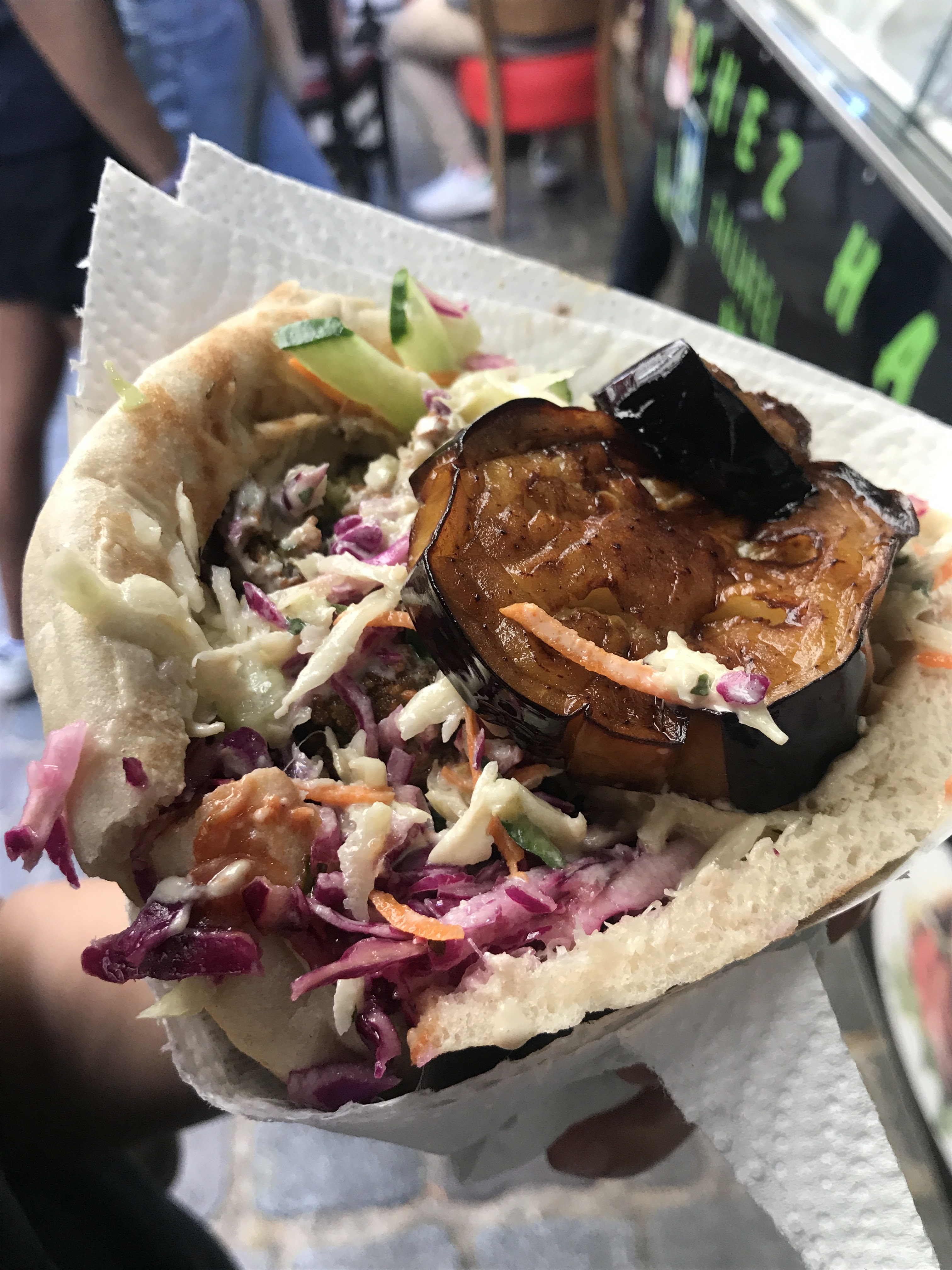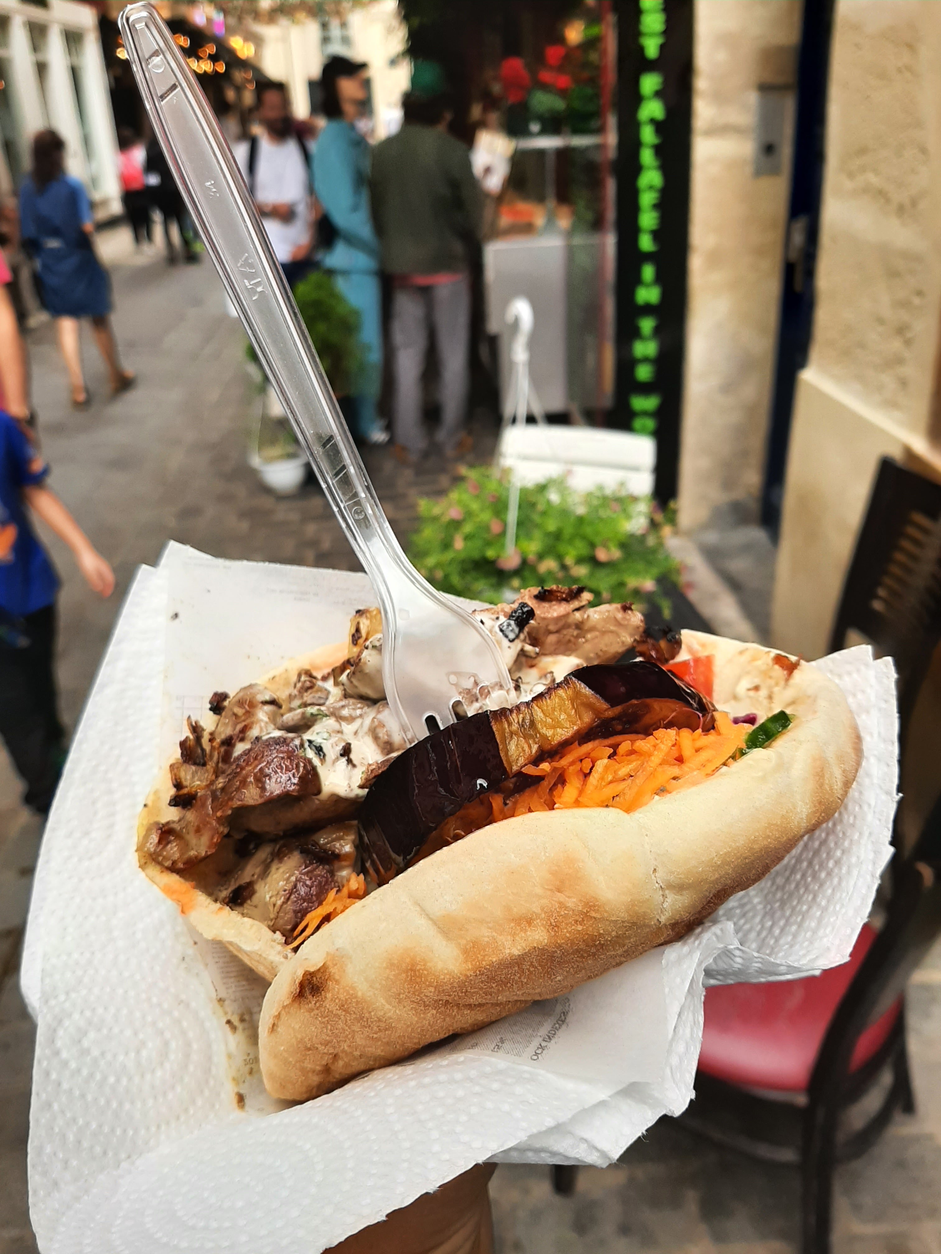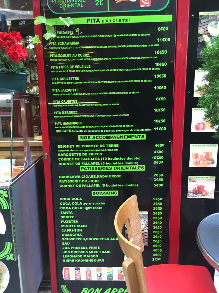 Nous avons pris 2 Pita Falafel à emporter (9€ / pita), et c’était vraiment bon ! Les quantités sont généreuses et les saveurs très variées en bouche. Léger bémol à la commande : On ne sait pas tout de suite qu’il faut rentrer pour commander, puis ressortir, pour enfin donner son ticket au cuisinier. Le système n’est pas très bien pensé à ce niveau là, surtout quand il y a du monde. Sinon c’est une bonne adresse de manière générale !