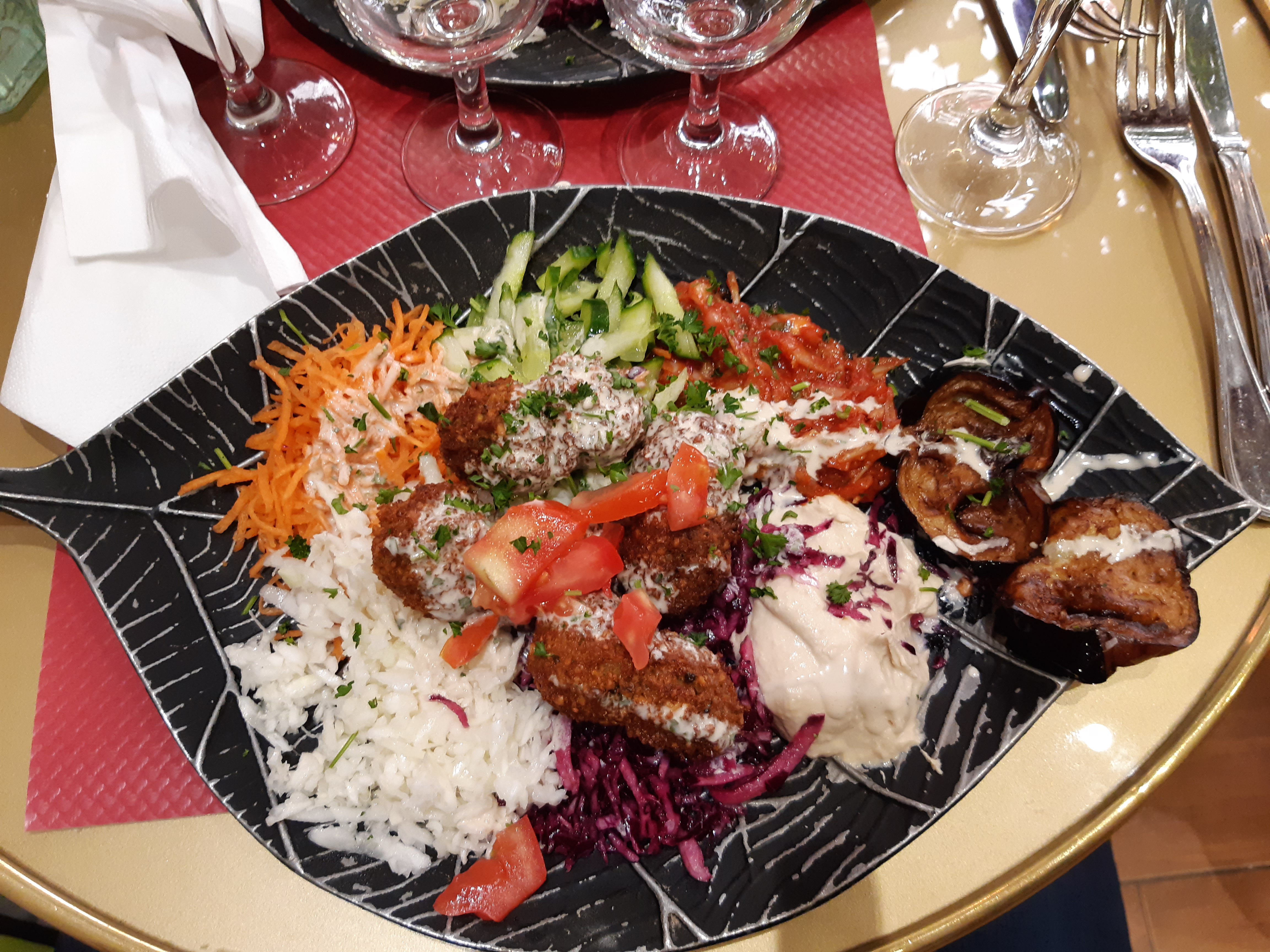 Plats délicieux mais le service et l'accueil sont à revoir. Sur la photo il s'agit de l'assiette falafel qui est vraiment bonne et copieuse !!