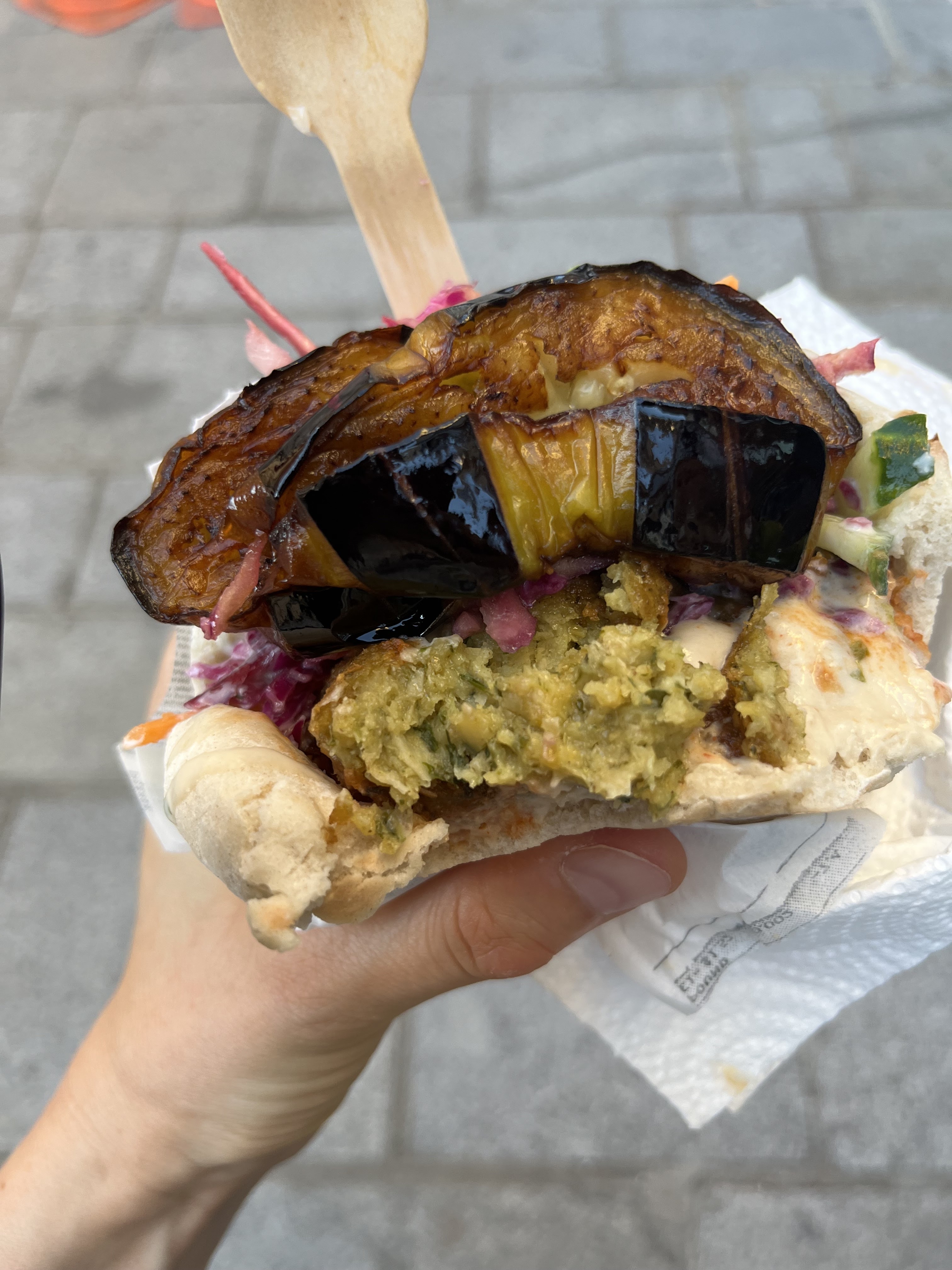Le falafel à emporter est copieux et savoureux (un petit bémol pour les aubergines un peu trop grasses à mon goût) mais très bon malgré tout