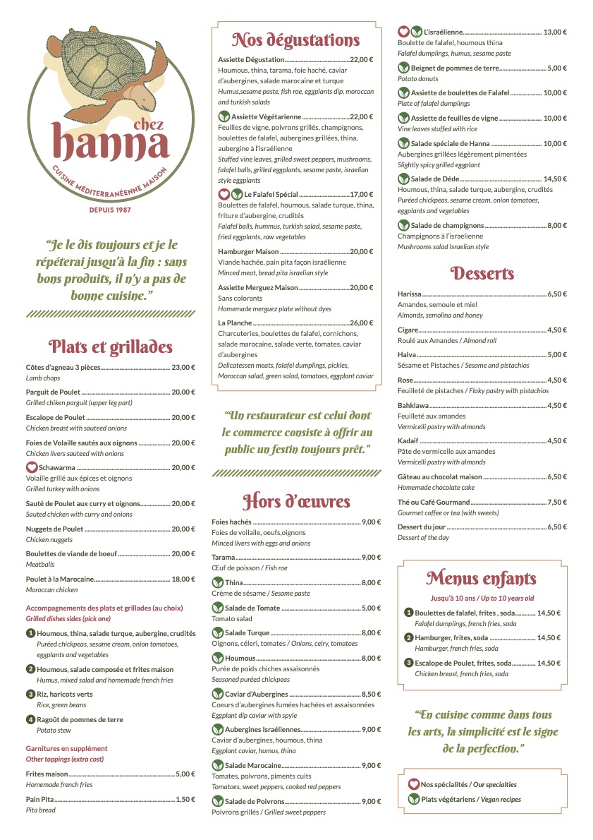 Cher Léo Loriol Merci beaucoup pour votre commentaire qui fait plaisir à lire,Toute l'équipe du Restaurant Chez Hanna vous remercie, Paris reste à votre disposition, n'hésitez pas à revenir. A très bientôt