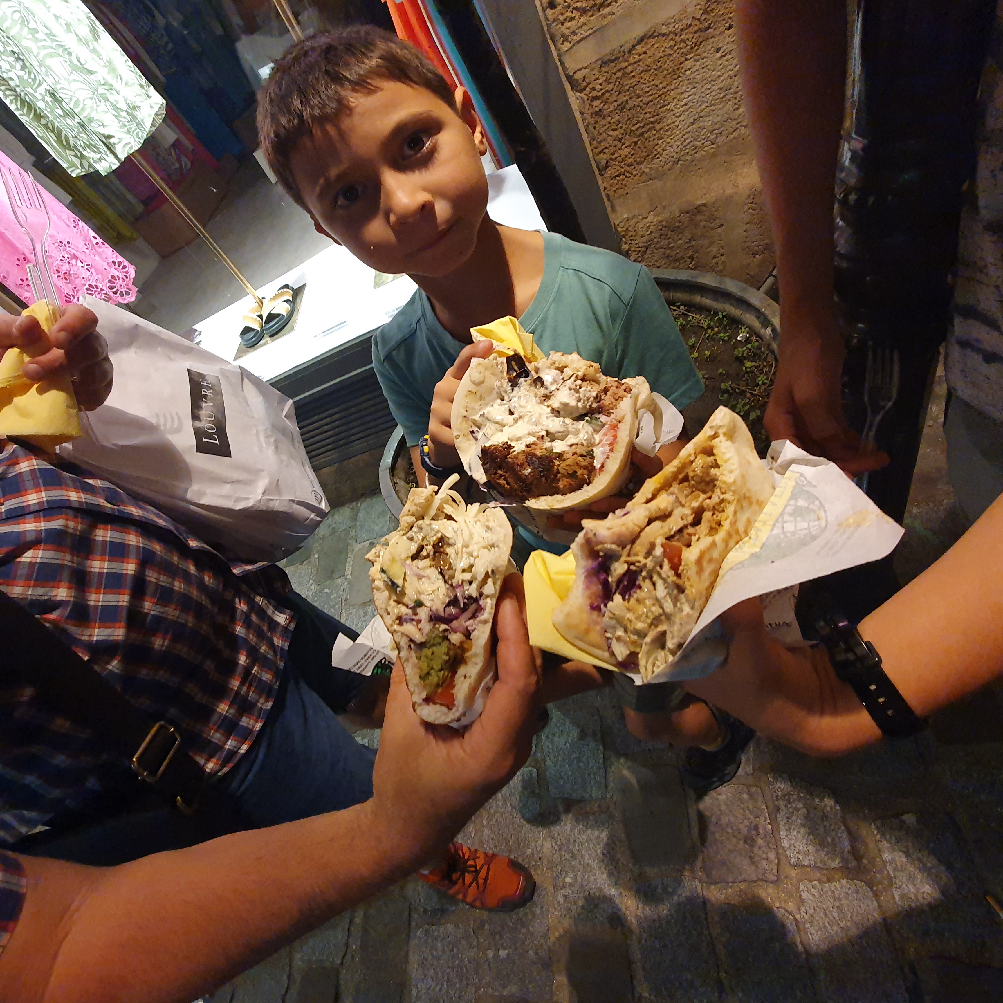 Ils ont dû nous trouver un peu pénibles. On a changé 4 fois de table. L'équipe mérite la palme d'or de la coolitude. Vous voulez quand même savoir si c'est bon ? C'est pas délicieux, c'est dé-li-cieux !! On a tout mangé et pourtant, c'était copieux. Le tout arrosé d'une Maccabi, une bière israélienne. Je récapitule : Recette pour un ventre plein et des papilles gustatives ravies : Une assiette mixte felafel chawarma et une Maccabi ou une gold Star. Vous allez me bénir.