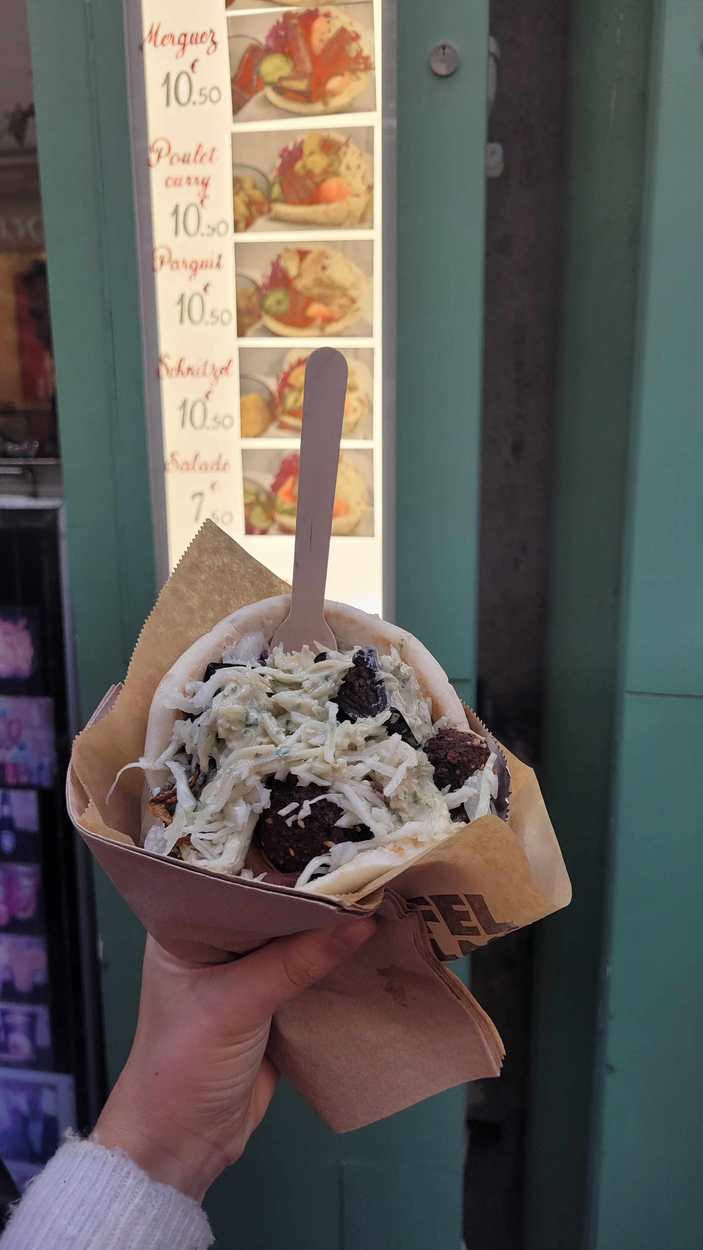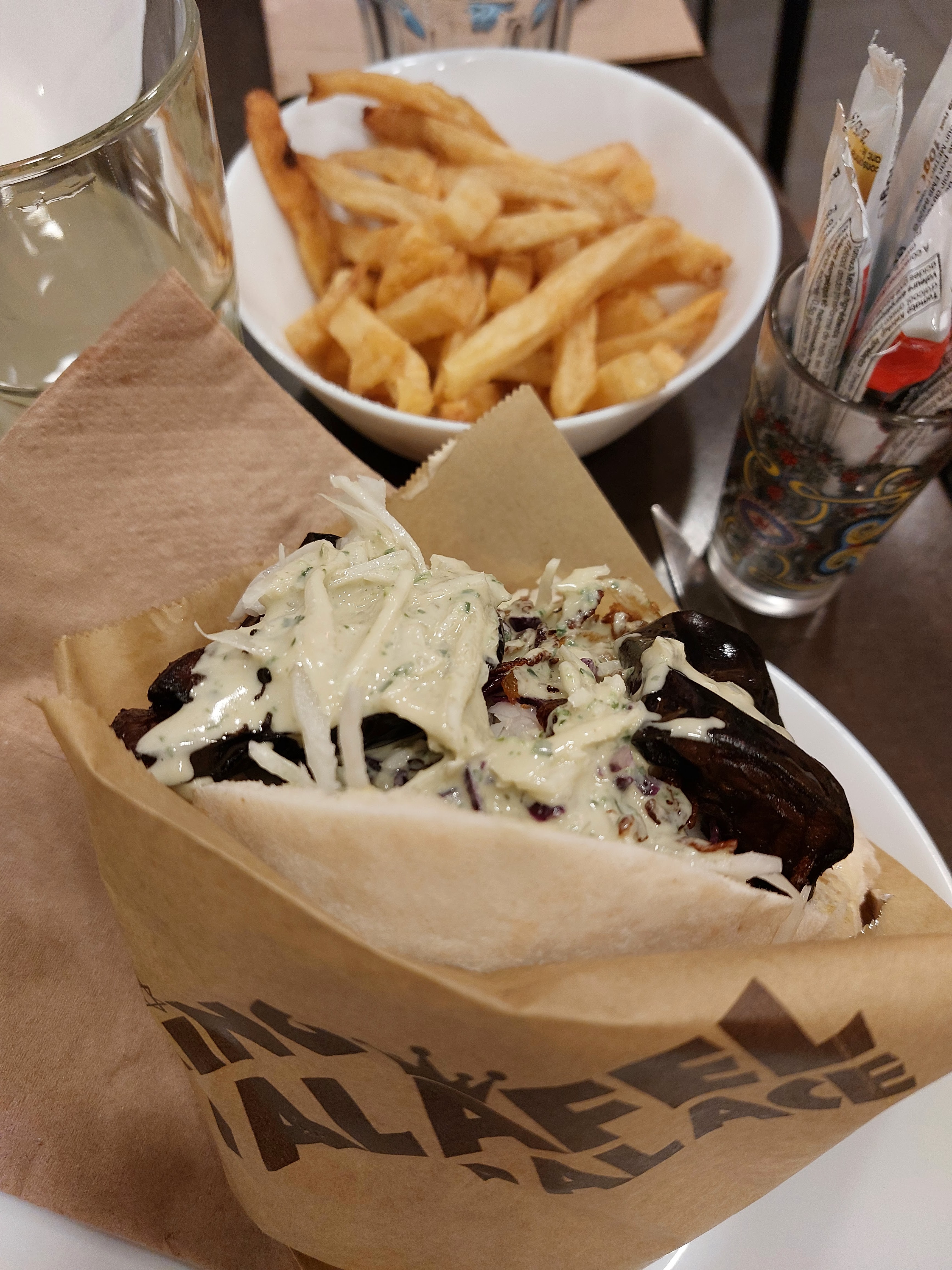 Le king falafel vaut le détour : très bon, généreux. Très bonne organisation. Et ouvert samedi 😌 ce qui m’a parfaitement convenu . Les légumes, et notamment les aubergines qu’ils ajoutent aux falafels, sont si délicieux !