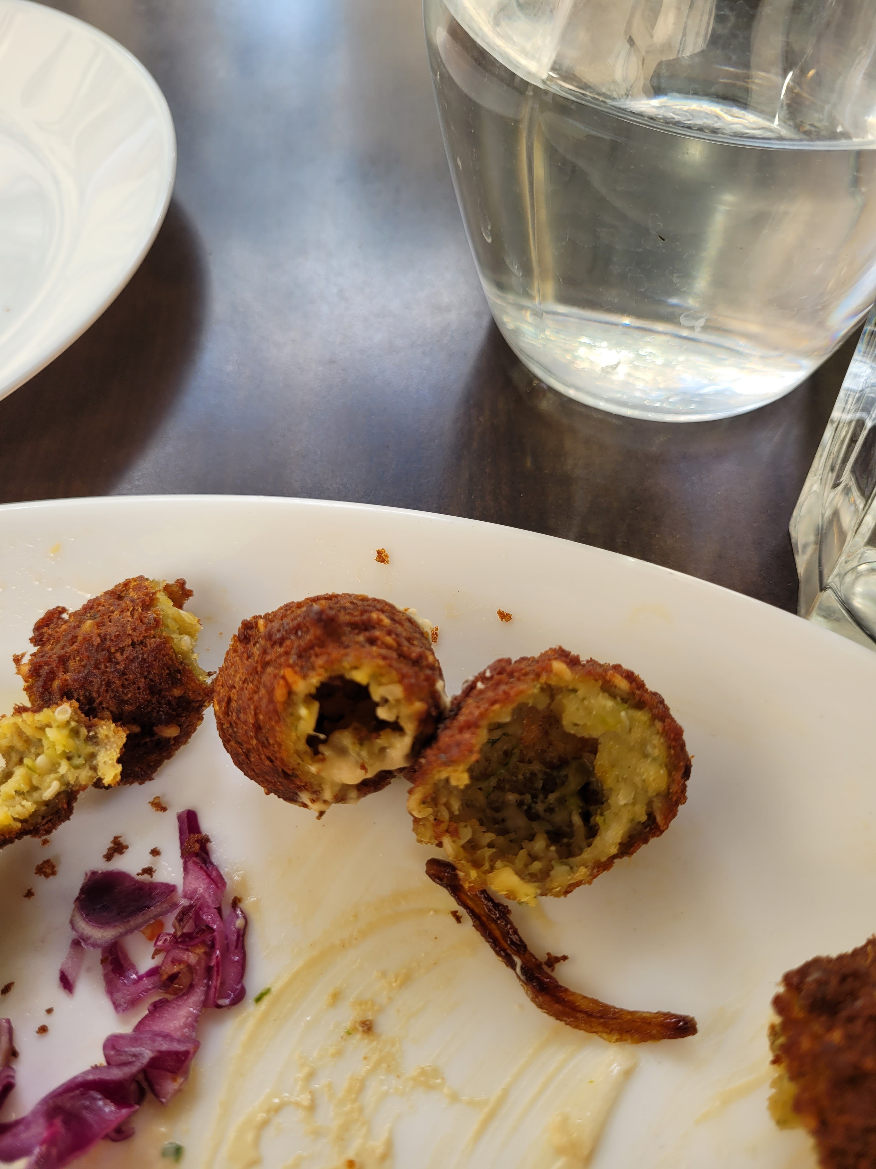 Pita falafel assez bonnes, mais tout est sur le dessus, et rapidement il n'y a plus que du pain pita sans rien dedans
